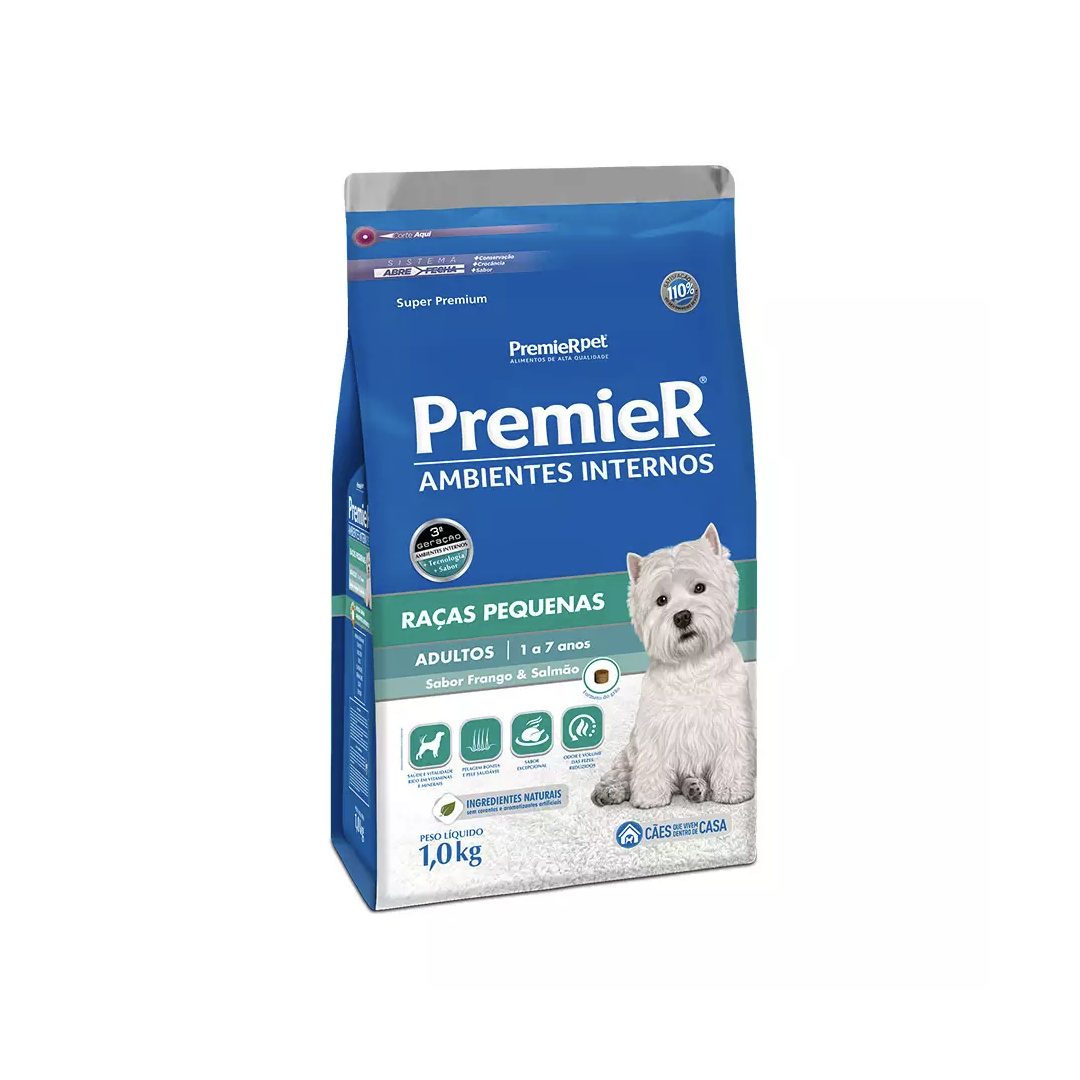 <p>Cães Adultos que vivem dentro de casa, em contato próximo com seus donos, têm necessidades nutricionais especiais | PremieR Ambientes Internos Adultos – Frango e Salmão é o primeiro alimento Super Premium específico para cães com este estilo de vida | Sua fórmula exclusiva contém somente ingredientes nobres, conferindo um excelente sabor, pelagem muito mais bonita e saudável, além de fezes em menor volume e odor reduzido.</p>
